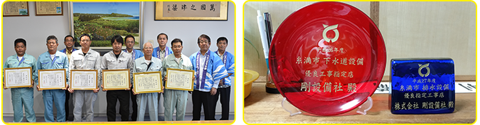 糸満市内の下水道接続工事で、特に浄化槽と汲み取り改造で多くの工事を実施したとして「剛設備社」は表彰されました。